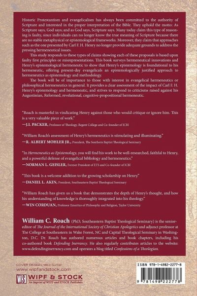 Historic Protestantism and evangelicalism has always been committed to the authority of Scripture and interested in the proper interpretation of the Bible. They uphold the motto: As Scripture says, God says; and as God says, Scripture says. Many today claim this type of reasoning is faulty, since individuals can no longer know the true meaning of Scripture because there are no stable metaphysical or epistemological frameworks. Moreover, they claim that approaches, such as the one presented by Carl F. H. Henry, no longer provide adequate grounds to address the pressing hermeneutical issues. This study responds to these types of claims showing each of these proposals is based upon faulty first principles or misrepresentations. This book surveys hermeneutical innovations and Henry's epistemological hermeneutic to show that Henry's epistemology is foundational to his hermeneutic, offering present-day evangelicals an epistemologically justified approach to hermeneutics as epistemology and methodology. The book will be of importance to those with interest in evangelical hermeneutics or philosophical hermeneutics in general. It provides a clear assessment of the impact of Carl F. H. Henry's epistemology and hermeneutic, and strives to respond to criticisms raised against his Augustinian, Reformed, revelational, cognitive-propositional hermeneutic.