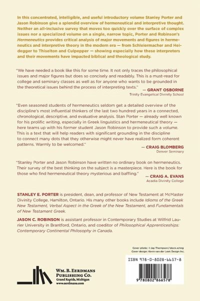 In this concentrated, intelligible, and useful introductory volume Stanley Porter and Jason Robinson give a splendid overview of hermeneutical and interpretive thought. Neither an all-inclusive survey that moves too quickly over the surface of complex issues nor a specialized volume on a single, narrow topic, Porter and Robinson's Hermeneutics provides critical analysis of major movements and figures in hermeneutics and interpretive theory in the modern era -- from Schleiermacher and Heidegger to Thiselton and Culpepper -- showing especially how these interpreters and their movements have impacted biblical and theological study.