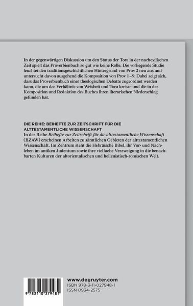In der gegenwärtigen Diskussion um den Status der Tora in der nachexilischen Zeit spielt das Proverbienbuch so gut wie keine Rolle. Demgegenüber hat die ältere Forschung immer wieder auf punktuelle Verbindungen zwischen dem Proverbienbuch und dem Deuteronomium sowie anderen Texten (Ps 119; Ps 19) hingewiesen. Die vorliegende Studie geht diesen Verbindungen am Beispiel von Prov 2 nach und stellt damit ein Kapitel in den Mittelpunkt der Untersuchung, das eine herausragende Stellung für die erste Sammlung des Sprüchebuches (Prov 1-9) hat.