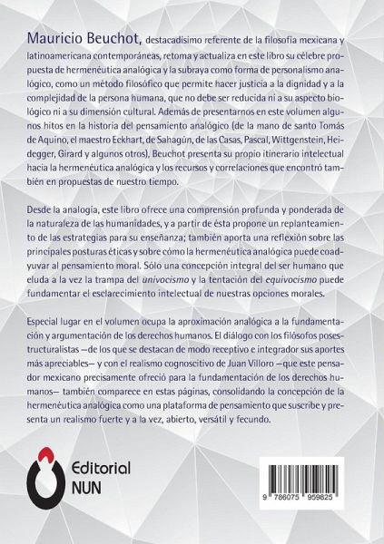 En este volumen me propongo examinar las relaciones de la hermenéutica con el estudio de la realidad. Por supuesto que ello nos conducirá a un realismo, un realismo analógico, pero, sobre todo, al conocimiento de esa realidad que tanto nos atañe como es el ser humano. Es el empeño de construir una hermenéutica analógica. Para tener una idea de ese instrumento conceptual, comienzo con una exposición del concepto de analogía en la historia, para llegar a la actualidad que puede tener una hermenéutica analógica. Ahora, después del univocismo de la modernidad, impera el equivocismo de la posmodernidad, y por eso se necesita un analogismo que nos haga salir de ese impasse. Tal será la función de la hermenéutica analógica. En esa línea y registro de la antropología filosófica, pero apoyada por la hermenéutica, introduzco el tema de las humanidades, haciendo hincapié en la necesidad de revisar su enseñanza en las universidades. Son sumamente necesarias, pero hay que hacer un replanteamiento de su enseñanza. Siempre se las ha querido hacer que imiten a las ciencias naturales, siendo que ellas, como se vio, tienen su estatuto epistemológico propio, que es hermenéutico. Por eso, se habla de la hermenéutica como un instrumento útil y valioso para la docencia en humanidades.