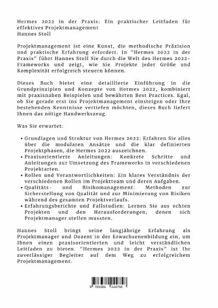 Hermes 2022 in der Praxis: Ein praktischer Leitfaden für effektives ProjektmanagementHannes StollProjektmanagement ist eine Kunst, die methodische Präzision und praktische Erfahrung erfordert. In "Hermes 2022 in der Praxis" führt Hannes Stoll Sie durch die Welt des Hermes 2022-Frameworks und zeigt, wie Sie Projekte jeder Größe und Komplexität erfolgreich steuern können.Dieses Buch bietet eine detaillierte Einführung in die Grundprinzipien und Konzepte von Hermes 2022, kombiniert mit praxisnahen Beispielen und bewährten Best Practices. Egal, ob Sie gerade erst ins Projektmanagement einsteigen oder Ihre bestehenden Kenntnisse vertiefen möchten, dieses Buch liefert Ihnen das nötige Handwerkszeug.Was Sie erwartet:_ Grundlagen und Struktur von Hermes 2022: Erfahren Sie alles über die modularen Ansätze und die klar definierten Projektphasen, die Hermes 2022 auszeichnen._ Praxisorientierte Anleitungen: Konkrete Schritte und Anleitungen zur Umsetzung des Frameworks in verschiedenen Projektarten._ Rollen und Verantwortlichkeiten: Ein klares Verständnis der verschiedenen Rollen im Projektteam und deren Aufgaben._ Qualitäts- und Risikomanagement: Methoden zur Sicherstellung von Qualität und zur Minimierung von Risiken während des gesamten Projektverlaufs._ Erfahrungsberichte und Fallstudien: Lernen Sie aus echten Projekten und den Herausforderungen, denen sich Projektmanager stellen mussten.Hannes Stoll bringt seine langjährige Erfahrung als Projektmanager und Dozent in der Erwachsenenbildung ein, um Ihnen einen praxisorientierten und leicht verständlichen Leitfaden zu bieten. "Hermes 2022 in der Praxis" ist Ihr zuverlässiger Begleiter auf dem Weg zu erfolgreichem Projektmanagement.