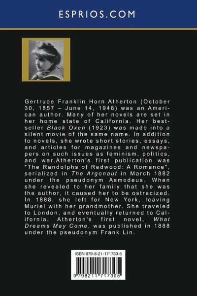 Gertrude Franklin Horn Atherton (October 30, 1857 - June 14, 1948) was an American author. Many of her novels are set in her home state of California. Her bestseller Black Oxen (1923) was made into a silent movie of the same name. In addition to novels, she wrote short stories, essays, and articles for magazines and newspapers on such issues as feminism, politics, and war. Atherton's first publication was "The Randolphs of Redwood: A Romance", serialized in The Argonaut in March 1882 under the pseudonym Asmodeus. When she revealed to her family that she was the author, it caused her to be ostracized. In 1888, she left for New York, leaving Muriel with her grandmother. She traveled to London, and eventually returned to California. Atherton's first novel, What Dreams May Come, was published in 1888 under the pseudonym Frank Lin.