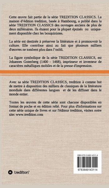 Cette uvre (édition relié) fait partie de la série TREDITION CLASSICS. La maison d édition tredition, basée à Hambourg, a publié dans la série TREDITION CLASSICS des ouvrages anciens de plus de deux millénaires. Ils étaient pour la plupart épuisés ou uniquement disponible chez les bouquinistes. La série est destinée à préserver la littérature et à promouvoir la culture. Avec sa série TREDITION CLASSICS, tredition à comme but de mettre à disposition des milliers de classiques de la littérature mondiale dans différentes langues et de les diffuser dans le monde entier.