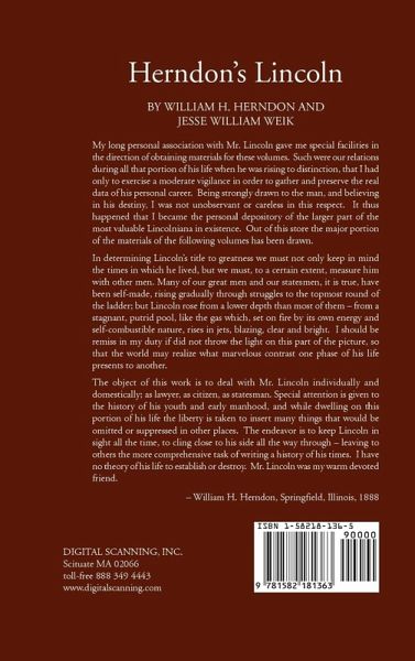 This edition contains all 3 Volumes in one binding. The type was reset for a clean look and appearance. The object of this work is to deal with Mr. Lincoln individually and domestically: as lawyer, as citizen, as statesman. Special attention is given to the history of his youth and early manhood, and while dwelling on this portion of his life the liberty is taken to insert many things that would be omitted or suppressed in other places. The endeavor is to keep Lincoln in sight all the time, to cling close to his side all the way through - leaving to others the more comprehensive task of writing a history of his times. I have no theory of his life to establish or destroy. Mr. Lincoln was my warm devoted friend. - William H. Herndon Springfield, Illinois, 1888 This Edition contains the following Appendix and A Full Index APPENDIX. Unpublished Family Letters 613 An Incident on the Circuit 619 Lincoln's Fellow Lawyers 620 The Truce with Douglas. - Testimony of Irwin 621 The Bloomington Convention. 621 An Office Discussion. - Lincoln's Idea of War 622 Lincoln and the Know-Nothings 623 Lincoln's Views on the Rights of Suffrage 625 The Burial of the Assassin Booth 625 A Tribute to Lincoln by a Colleague at the Bar 626 INDEX 629