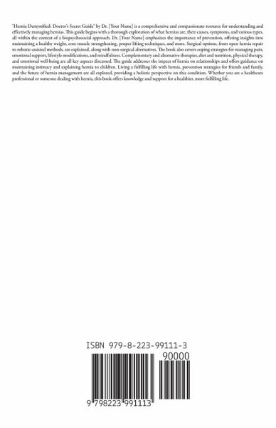 "Hernia Demystified: Doctor's Secret Guide" by Dr. [Your Name] is a comprehensive and compassionate resource for understanding and effectively managing hernias. This guide begins with a thorough exploration of what hernias are, their causes, symptoms, and various types, all within the context of a biopsychosocial approach. Dr. [Your Name] emphasizes the importance of prevention, offering insights into maintaining a healthy weight, core muscle strengthening, proper lifting techniques, and more. Surgical options, from open hernia repair to robotic-assisted methods, are explained, along with non-surgical alternatives. The book also covers coping strategies for managing pain, emotional support, lifestyle modifications, and mindfulness. Complementary and alternative therapies, diet and nutrition, physical therapy, and emotional well-being are all key aspects discussed. The guide addresses the impact of hernia on relationships and offers guidance on maintaining intimacy and explaining hernia to children. Living a fulfilling life with hernia, prevention strategies for friends and family, and the future of hernia management are all explored, providing a holistic perspective on this condition. Whether you are a healthcare professional or someone dealing with hernia, this book offers knowledge and support for a healthier, more fulfilling life.