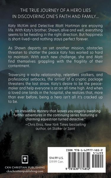 The true journey of a hero lies in discovering one's faith and family... Katy McKim and Detective Matt Hartman are enjoying life. With Katy's brother, Shawn, alive and well, everything seems to be heading in the right direction. But happiness is short-lived-and nothing stays perfect forever. As Shawn departs on yet another mission, obstacles threaten to shatter the peace Katy has worked so hard to maintain. With each new challenge, she and Matt find themselves grappling with the fragility of their contentment. Traversing a rocky relationship, relentless stalkers, and professional setbacks, the arrival of a cryptic package threatens the last straw. Katy's desire to be the peacemaker and help everyone is at an all-time high. And when a loved one lands in the hospital, she realizes that, more than ever before, being a hero isn't all it's cracked up to be. "... an irresistible mystery that leaves you eagerly awaiting further adventures in the continuing series featuring a charming equestrian turned detective." -Chris Enss, New York Times bestselling author, on Stalker or Saint