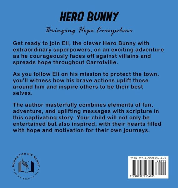 Get ready to join Eli, the clever Hero Bunny with extraordinary superpowers, on an exciting adventure as he courageously faces off against villains and spreads hope throughout Carrotville. As you follow Eli on his mission to protect the town, you'll witness how his brave actions uplift those around him and inspire others to be their best selves. The author masterfully combines elements of fun, adventure, and uplifting messages with scripture in this captivating story. Your child will not only be entertained but also inspired, with their hearts filled with hope and motivation for their own journeys.