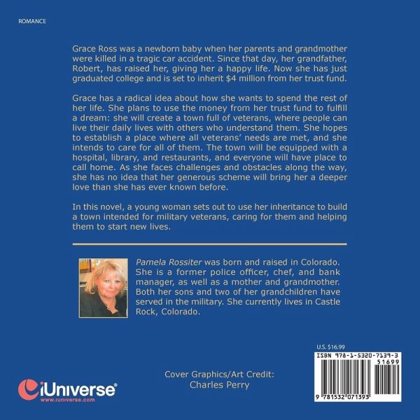 Grace Ross was a newborn baby when her parents and grandmother were killed in a tragic car accident. Since that day, her grandfather, Robert, has raised her, giving her a happy life. Now she has just graduated college and is set to inherit $4 million from her trust fund. Grace has a radical idea about how she wants to spend the rest of her life. She plans to use the money from her trust fund to fulfill a dream: she will create a town full of veterans, where people can live their daily lives with others who understand them. She hopes to establish a place where all veterans' needs are met, and she intends to care for all of them. The town will be equipped with a hospital, library, and restaurants, and everyone will have place to call home. As she faces challenges and obstacles along the way, she has no idea that her generous scheme will bring her a deeper love than she has ever known before. In this novel, a young woman sets out to use her inheritance to build a town intended for military veterans, caring for them and helping them to start new lives.