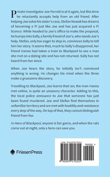 Private Investigator Joe Parrott is at it again, but this time he reluctantly accepts help from an old friend. After helping Joe solve his sister's case, Stefan Nowak has dreams of becoming a PI just like Joe and has just acquired a PI licence. While headed to Joe's office to make the proposal, he bumps into Sally, a family friend of Joe's, who needs Joe's help. Stefan, only too eager to step in, convinces Sally to tell him her story. It seems that, much to Sally's disapproval, her friend Hanna had taken a train to Blackpool to see a man she met on a dating site and has not returned. Sally has not heard from her since. When Joe hears the story, he initially isn't convinced anything is wrong. He changes his mind when the three make a gruesome discovery. Travelling to Blackpool, Joe learns that Ian, the man Hanna met online, is quite an unsavory character. Adding to this, the local police announce to Joe that someone has just been found murdered. Joe and Stefan find themselves in unfamiliar territory and are met with hostility and resistance every step of the way. On top of that, they cannot distinguish friend from foe. In Hero of Blackpool, anyone is fair game, and when the rats come out at night, only a hero can save you.