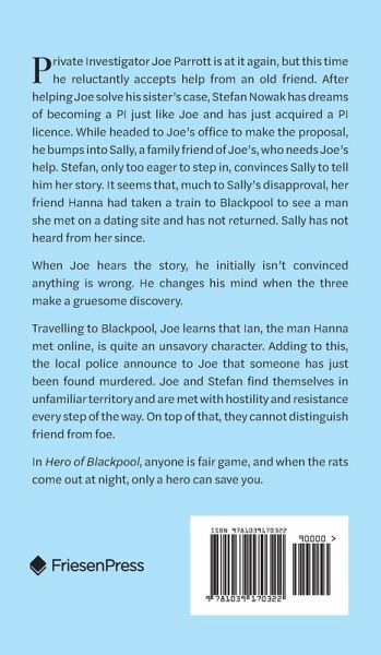 Private Investigator Joe Parrott is at it again, but this time he reluctantly accepts help from an old friend. After helping Joe solve his sister's case, Stefan Nowak has dreams of becoming a PI just like Joe and has just acquired a PI licence. While headed to Joe's office to make the proposal, he bumps into Sally, a family friend of Joe's, who needs Joe's help. Stefan, only too eager to step in, convinces Sally to tell him her story. It seems that, much to Sally's disapproval, her friend Hanna had taken a train to Blackpool to see a man she met on a dating site and has not returned. Sally has not heard from her since. When Joe hears the story, he initially isn't convinced anything is wrong. He changes his mind when the three make a gruesome discovery. Travelling to Blackpool, Joe learns that Ian, the man Hanna met online, is quite an unsavory character. Adding to this, the local police announce to Joe that someone has just been found murdered. Joe and Stefan find themselves in unfamiliar territory and are met with hostility and resistance every step of the way. On top of that, they cannot distinguish friend from foe. In Hero of Blackpool, anyone is fair game, and when the rats come out at night, only a hero can save you.