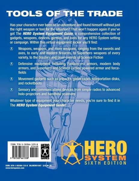 The Hero System Equipment Guide contains hundreds of pre-generated weapons, defensive devices, sensors, communication devices, movement devices, and other gadgets for use in your HERO System games. It includes only personal equipment - the sorts of weapons and devices characters might carry themselves on their adventures.