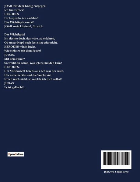 JOAB tritt dem König entgegen. Ich bin zurück! HERODES. Dich spreche ich nachher! Das Wichtigste zuerst! JOAB zurücktretend, für sich. Das Wichtigste! Ich dächte doch, das wäre, zu erfahren, Ob unser Kopf noch fest sitzt oder nicht. HERODES winkt Judas. Wie steht es mit dem Feuer? JUDAS. Mit dem Feuer? So weißt du schon, was ich zu melden kam? HERODES. Um Mitternacht brachs aus. Ich war der erste, Der es bemerkte und die Wache rief. Irr ich mich nicht, so weckte ich dich selbst! JUDAS. Es ist gelöscht! ...