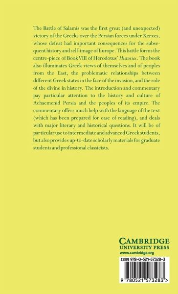 The Battle of Salamis was the first great (and unexpected) victory of the Greeks over the Persian forces under Xerxes, whose defeat had important consequences for the subsequent history and self-image of Europe. This battle forms the centre-piece of book VIII of Herodotus' Histories. The book also illuminates Greek views of themselves and of peoples from the East, the problematic relationships between different Greek states in the face of the invasion, and the role of the divine in history. This introduction and commentary pays particular attention to the history and culture of Achaemenid Persia and the peoples of its empire. It offers much help with the language of the text (which has been prepared for ease of reading), and deals with major literary and historical questions. It will be of especial use to intermediate and advanced Greek students, but also provides up-to-date scholarly materials for graduate students and professional classicists.
