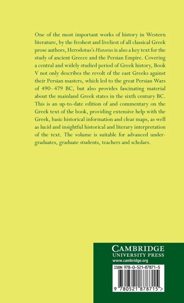 One of the most important works of history in Western literature, by the freshest and liveliest of all classical Greek prose authors, Herodotus's Histories is also a key text for the study of ancient Greece and the Persian Empire. Covering a central and widely studied period of Greek history, Book V not only describes the revolt of the east Greeks against their Persian masters, which led to the great Persian Wars of 490-479 BC, but also provides fascinating material about the mainland Greek states in the sixth century BC. This is an up-to-date edition of and commentary on the Greek text of the book, providing extensive help with the Greek, basic historical information and clear maps, as well as lucid and insightful historical and literary interpretation of the text. The volume is suitable for advanced undergraduates, graduate students, teachers and scholars.