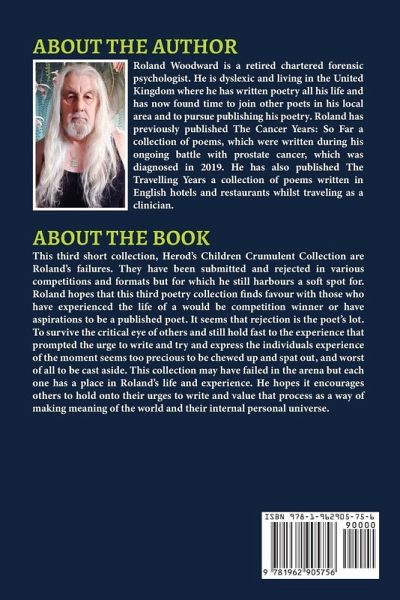 About the Author Roland Woodward is a retired chartered forensic psychologist living in the United Kingdom. Despite being dyslexic, he has been writing poetry throughout his life. Recently, Roland has dedicated more time to his passion, joining fellow poets in his local area and pursuing publication opportunities. Roland's previous work includes The Cancer Years: So Far, a poignant collection of poems chronicling his ongoing battle with prostate cancer since his diagnosis in 2019. Additionally, he has published The Travelling Years, inspired by his experiences in English hotels and restaurants during his time as a clinician. About the Book Herod's Children Crumulent Collection is Roland's third short poetry collection, focusing on his experiences of failure. Despite being submitted to various competitions and formats, these poems have faced rejection. However, Roland maintains a fondness for them, recognizing the value of each piece in his own life and experience. Through this collection, he hopes to resonate with others who have faced similar challenges in the pursuit of their artistic aspirations. Roland encourages aspiring writers to embrace the writing process as a means of finding meaning in both the external world and their internal universe.