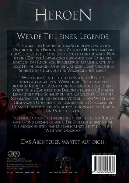 Werde Teil einer Legende!Dragoma - ein Kaiserreich am Scheideweg zwischen Untergang und Erneuerung. Zahllose Helden haben in der Geschichte des Landes ihre Spuren hinterlassen. Nun ist eine Zeit der Umwälzung gekommen: der Kaiser verschollen, das Reich vom Bürgerkrieg zerrissen, alte und neue Feinde drängen über die Grenzen ... und vergessene Schrecken steigen aus der Vergangenheit empor.Wird deine Geschichte den Sagen des Reiches hinzugefügt werden? Wirst du als Ritter mit der blanken Klinge die Armen und Schwachen beschützen? Wirst du als Zauberer den Dämonen früherer Zeitalter Einhalt gebieten? Schaust du nur als Söldner, Dieb oder Scharlatan auf deinen eigenen Vorteil in den Wirren der Gegenwart? Oder siehst du gar als Feind Dragomas die Chance gekommen, ein für allemal der Macht der Kaiser ein Ende zu setzen?In diesem Fantasy-Rollenspiel steht dir jede dieser Rollen offen - und unzählige mehr. Die Spielregeln sind simpel, die Möglichkeiten nahezu unbegrenzt. Tritt ein in dieWelt von Dragoma!Das Abenteuer wartet auf dich!Systemeigenschaften:- W6-basiert- Beispielabenteuer enthalten- Charakterbögen, Kurzanleitung und andere Ressourcen zum freien Download unter http://heroen.gerwinski.de