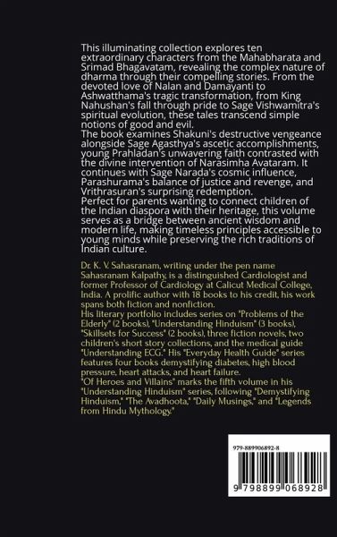 Do you wish to instill in your children the timeless values and teachings found in the Hindu Puranas, These stories filled with wisdom, culture, and ethics that can shape young minds and strengthen their roots in Indian heritage The book delves into the labyrinthine psyches of ten extraordinary characters from the Mahabharata and Bhagavatam, whose lives illuminate the ineffable nature of Dharma Witness the sublime love of Nalan and Damayanti Follow the transformation of Ashwatthama from warrior to eternal wanderer Journey with King Nahushan as pride transmutes merit into monstrosity, Observe the will of Sage Vishwamitra, whose metamorphosis from king to rishi unveils the transcendent power of perseverance The Machiavellian machinations of Shakuni reveal how personal grievance can catalyze catastrophic war, while Sage Agasthya's miraculous feats demonstrate the sublime potential that dwells within ascetic discipline. o Marvel at the unwavering devotion of young Prahladan and the awe-inspiring manifestation of Narasimha Avataram-a testament to divine intervention when Dharma stands imperiled o The celestial wanderings of Sage Narada offer glimpses into the sublime orchestration of universal events, while Parashurama's righteous fury exemplifies the razor's edge between justice and vengeance o The tale of Vrithrasuran illuminates the profound truth that even demons may harbor seeds of divinity.