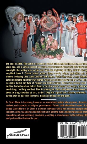 The year is 2145. The world is in turmoil. Quality leadership disappeared more than 100 years ago, and a sel¿sh mindset has taken over throughout the world. This didn’t happen overnight; the writing was on the wall from the beginning of time, and the decay has ampli¿ed times 7. Former feeble leaders threw morals, values, and ethics out of the window, believing they could outsmart the Divine. Fools! The world is now divided into seven continents with their own wicked rulers in an alliance known as the 7 CA. Their Law is simple: Forbid any type of religion and loathe women. Those who disobey meet their destiny: Instant death or Hatred Camp, a fate far worse. There is no escape, and the world needs help, real help and fast. Time is running out...Then, the Heroes from Heaven come down to bring salvation at last. In the 7-Day War against the alliance continents, they sweep away all evil from the world, making all things new and good.