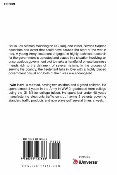 Set in Los Alamos, Washington DC, Iraq, and Israel, Heroes Happen describes one event that could have caused the start of the war in Iraq. A young Army lieutenant engaged in highly technical research for the government is uprooted and placed in a situation involving an unscrupulous government plot to make a handful of private business friends rich to the detriment of several nations. In the process of serving his country, the lieutenant falls in love with a highly placed government official and both of their lives are endangered.