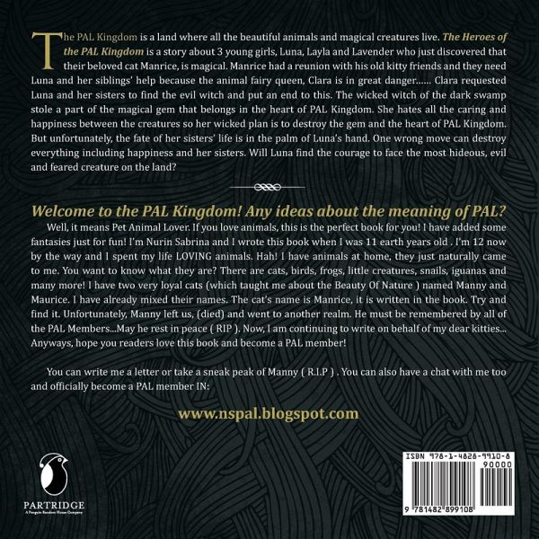 The PAL Kingdom is a land where all the beautiful animals and magical creatures live. The Heroes of the PAL Kingdom is a story about 3 young girls, Luna, Layla and Lavender who just discovered that their beloved cat Manrice, is magical. Manrice had a reunion with his old kitty friends and they need Luna and her siblings' help because the animal fairy queen, Clara is in great danger...... Clara requested Luna and her sisters to find the evil witch and put an end to this. The wicked witch of the dark swamp stole a part of the magical gem that belongs in the heart of PAL Kingdom. She hates all the caring and happiness between the creatures so her wicked plan is to destroy the gem and the heart of PAL Kingdom. But unfortunately, the fate of her sisters' life is in the palm of Luna's hand. One wrong move can destroy everything including happiness and her sisters. Will Luna find the courage to face the most hideous, evil and feared creature on the land?