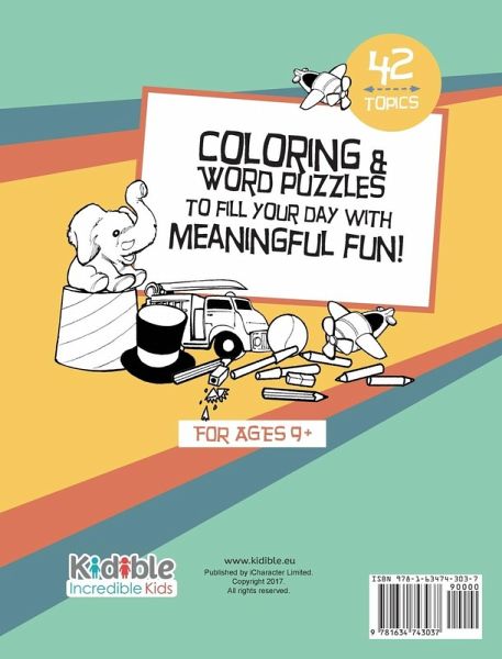 Coloring & word puzzles on 42 topics, to fill your time with meaningful fun! Suggested for ages 7-10. For more great products, visit our website at www.kidible.eu Note: This is the coloring and word puzzle book version. Find the complete story book by searching for one of the following ISBN numbers: "Story Encyclopedia of Values and Habits" (Hardcover) 9781634740661 "Story Encyclopedia of Values and Habits" (Softcover) 9781634740678