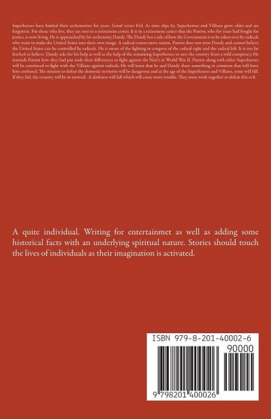 Superheroes have battled their archenemies for years. Good verses Evil. As time slips by, Superheroes and Villians grow older and are forgotten. For those who live, they are sent to a retirement center. It is in a retirement center that the Patriot, who for years had fought for justice, is now living. He is approached by his archenemy Dandy. The Dandy has a tale of how the Government is to be taken over by radicals who want to make the United States into their own image. A radical conservative nation. Patriot does not trust Dandy and cannot believe the United States can be controlled by radicals. He is aware of the fighting in congress of the radical right and the radical left. It is too far fetched to believe. Dandy asks for his help as well as the help of the remaining Superheroes to save the country from a wild conspiracy. He reminds Patriot how they had put aside their differences to fight against the Nazi's in World War II. Patriot along with other Superheroes will be convinced to fight with the Villians against radicals. He will learn that he and Dandy share something in common that will leave him confused. The mission to defeat the domestic terriorist will be dangerous and at the age of the Superheroes and Villians, some will fall. If they fail, the country will be in turmoil. A darkness will fall which will cause more trouble. They must work together to defeat this evil.