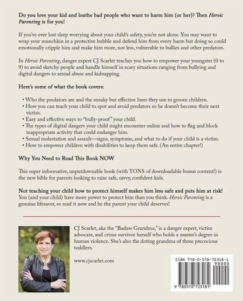 Do you love your child and loathe bad people who want to harm him? Then Heroic Parenting is for you! If you've ever lost sleep worrying about your child's safety, you're not alone. You may want to wrap your munchkin in a protective bubble and defend him from every harm but doing so could emotionally cripple him and make him more, not less, vulnerable to predators. In Heroic Parenting, danger expert CJ Scarlet helps you teach your child how to handle himself in scary situations, ranging from bullying and digital dangers to sexual abuse and kidnapping. After reading this book, you'll feel more knowledgeable and confident in your ability to talk candidly with your child at his age and maturity level without scaring him to death. It's time to ditch the worry and get some sleep! This super informative, unputdownable book (with TONS of downloadable bonus content!) is the new bible for parents looking to raise safe, savvy, confident kids. IMPORTANT NOTE: Heroic Parenting is an alternate version of Badass Parenting: An Irreverent Guide to Raising Safe, Savvy, Confident Kids-a much snarkier, edgier book that contains profanity. (If you're NOT put off by foul language, you'll definitely want to read Badass Parenting instead.) However, if you prefer a family-friendly version of the book, Heroic Parenting is for you. Know that while the swearing is redacted, the wisdom is not! HERE'S WHAT THE BOOK COVERS:REASSURING facts revealing the REAL truth about the dangers your child faces. Who the predators are and the sneaky but effective lures they use to groom children. How YOU can empower your child, using the body safety skills in this book, to help him spot predators and avoid them so he doesn't become their next victim. Why other kids are a greater sexual threat to your child than you think. What to do when the abuser is your partner or ex. The 3 different kinds of bullying and the 8 types of bullies your kid might encounter. Easy & effective ways to "bully-proof" your child & teach him to "train" bullies to leave him alone. The types of digital dangers your child might encounter online and how to flag and block inappropriate activity that could endanger him. Why that "innocent" selfie of your child could land him and his friends on the sex offender registry for life. Sexual molestation & assault-signs, symptoms, & what to do if your child is a victim. Spotting concerning sexual behavior that you need to address asap. How to empower children with disabilities to keep them safe. (An entire chapter!) Helping your traumatized child to heal after a victimization. How to boost your child's confidence & self-esteem-the best predator-repellants of all! How to teach your kid to fight off predators without knowing any formal martial arts or self-defense moves. Using monthly family meetings to teach body safety rules and keep the lines of communication open with your child. Not teaching your child how to protect himself makes him less safe and puts him at risk! Parent up and teach him what he needs to know to avoid sketchy people and handle dangerous encounters with predators. Be the parent your child deserves!
