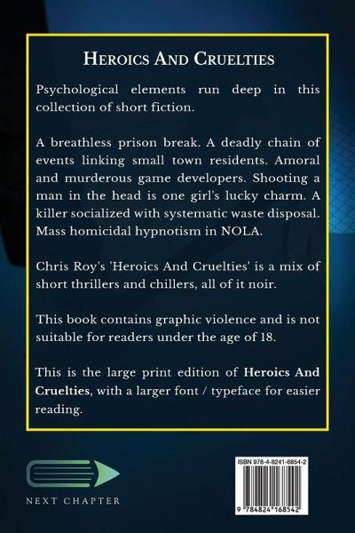 Psychological elements run deep in this collection of short fiction. A breathless prison break. A deadly chain of events linking small town residents. Amoral and murderous game developers. Shooting a man in the head is one girl's lucky charm. A killer socialized with systematic waste disposal. Mass homicidal hypnotism in NOLA. Chris Roy's 'Heroics And Cruelties' is a mix of short thrillers and chillers, all of it noir. This book contains graphic violence and is not suitable for readers under the age of 18. ¿¿¿¿This is the large print edition of Heroics And Cruelties, with a larger font / typeface for easier reading.