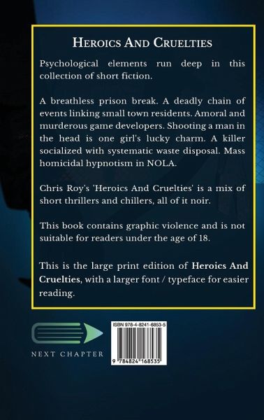 Psychological elements run deep in this collection of short fiction. A breathless prison break. A deadly chain of events linking small town residents. Amoral and murderous game developers. Shooting a man in the head is one girl's lucky charm. A killer socialized with systematic waste disposal. Mass homicidal hypnotism in NOLA. Chris Roy's 'Heroics And Cruelties' is a mix of short thrillers and chillers, all of it noir. This book contains graphic violence and is not suitable for readers under the age of 18. ¿¿¿This is the large print edition of Heroics And Cruelties, with a larger font / typeface for easier reading.