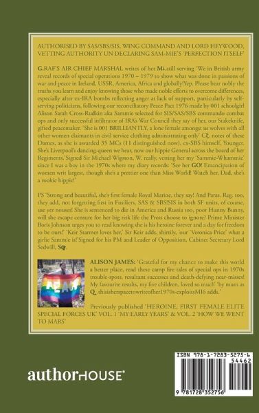 BOOK AUTHORISED BY SAS/SBS/SIS, WING COMMAND AND LORD HEYWOOD, VETTING AUTHORITY UN DECLARING SAM-MIE'S 'PERFECTION ITSELF' G.RAF'S AIR CHIEF MARSHAL writes of this book by Alison James as M. still serving 'We in British army reveal records of special operations 1970 - 1979 to show what was done in passions of war and peace in Ireland, USSR, America, Africa and globally!Yep. Please bear nobly the truths you learn and enjoy knowing those who made noble efforts to overcome differences, especially after ex-IRA bombs reflecting anger at lack of support, particularly by selfserving politicians, following our reconciliatory Peace Pact 1976 made by 001 schoolgirl Alison Sarah Cross-Rudkin aka Sammie selected for SAS/SBS/SIS commando combat ops and only successful infiltrator of IRA's War Council, they say of her, our Stakeknife, gifted peacemaker. 'She is 001 BRILLIANTLY, a lone female amongst us wolves with all other women claimants in civil service clothing administrating only' C. notes of these Dames, as she is awarded 35 MCs (11 distinguished now), ex-SBS himself, Younger. She's Liverpool's dancing-queen we hear, now our hippie General across the board of her Regiments.'Signed Sir Michael Wigston, W. really, vetting her my 'Sammie-Whammie' since I was a boy in the 1970s where my diary records: 'See her GO! Emancipation of women writ largest, though she's a prettier one than Miss World! Watch her, Dad, she's a rookie hippie!' PS 'Strong and beautiful, she's first female Royal Marine, they say! And Paras. Reg. too, they add, not forgetting first in Fusiliers, SAS & SBS!SIS in both SF units, of course, use yer nouses! She is sentenced to die in America and Russia too, poor Hunny Bunny, will she escape censure for her big risk life the Press choose to ignore? Prime Minister Boris Johnson urges you to read knowing she is his heroine forever and a day for freedom to be ours!' 'Keir Starmer loves her,' Sir Keir adds, shirtily, 'our 'Veronica Price' what a girlie Sammie is!'Signed for his PM and Leader of Opposition, Cabinet Secretary Lord Sedwill, S.