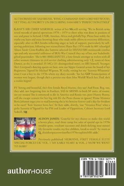 BOOK AUTHORISED BY SAS/SBS/SIS, WING COMMAND AND LORD HEYWOOD, VETTING AUTHORITY UN DECLARING SAM-MIE'S 'PERFECTION ITSELF' G.RAF'S AIR CHIEF MARSHAL writes of this book by Alison James as M. still serving 'We in British army reveal records of special operations 1970 - 1979 to show what was done in passions of war and peace in Ireland, USSR, America, Africa and globally!Yep. Please bear nobly the truths you learn and enjoy knowing those who made noble efforts to overcome differences, especially after ex-IRA bombs reflecting anger at lack of support, particularly by selfserving politicians, following our reconciliatory Peace Pact 1976 made by 001 schoolgirl Alison Sarah Cross-Rudkin aka Sammie selected for SAS/SBS/SIS commando combat ops and only successful infiltrator of IRA's War Council, they say of her, our Stakeknife, gifted peacemaker. 'She is 001 BRILLIANTLY, a lone female amongst us wolves with all other women claimants in civil service clothing administrating only' C. notes of these Dames, as she is awarded 35 MCs (11 distinguished now), ex-SBS himself, Younger. She's Liverpool's dancing-queen we hear, now our hippie General across the board of her Regiments.'Signed Sir Michael Wigston, W. really, vetting her my 'Sammie-Whammie' since I was a boy in the 1970s where my diary records: 'See her GO! Emancipation of women writ largest, though she's a prettier one than Miss World! Watch her, Dad, she's a rookie hippie!' PS 'Strong and beautiful, she's first female Royal Marine, they say! And Paras. Reg. too, they add, not forgetting first in Fusiliers, SAS & SBS!SIS in both SF units, of course, use yer nouses! She is sentenced to die in America and Russia too, poor Hunny Bunny, will she escape censure for her big risk life the Press choose to ignore? Prime Minister Boris Johnson urges you to read knowing she is his heroine forever and a day for freedom to be ours!' 'Keir Starmer loves her,' Sir Keir adds, shirtily, 'our 'Veronica Price' what a girlie Sammie is!'Signed for his PM and Leader of Opposition, Cabinet Secretary Lord Sedwill, S.