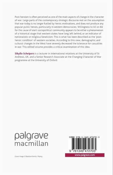 Introduction: Toward Post-Heroic Warfare?; Sibylle Scheipers PART I: HEROISM AND SELF-SACRIFICE - WHAT FOR? 1. Heroism and the Nation during the French Revolutionary and Napoleonic Wars and the Age of Military Reform in Europe; Thomas Hippler 2. 'On the Altar of the Nation': Narratives of Heroic Sacrifice in the American Civil War; Adam Smith 3. 'Heroic' Warfare and the Problem of Mass Armies, France 1871-1914; Hew Strachan 4. Heroism and Self-Sacrifice for the Nation? Wars of National Liberation; Rob Johnson 5. War against Evil: The Second World War; Peter Schrijvers 6. Mass Armies and the Cold War: Institutional Post-Heroism?; Ingo Trauschweizer 7. Heroism and Self-Sacrifice: The Vietnam War as a Case in Point; Bernd Greiner 8. The Dilemma of Cosmopolitan Soldiering; Cheyney Ryan PART II: CASUALTY AVERSION 9. Provocations on Policymakers, Casualty Aversion, and Post-Heroic Warfare; Peter D. Feaver and Charles Miller 10. 'Casualty Aversion': Media, Society, and Public Opinion; Susan Carruthers 11. Questioning the Post-Heroic Warfare Logic: Private Contractors, Casualty Sensitivity and Public Support for War in the United States; Deborah Avant 12. Redefining Standoff Warfare: Modern Efforts and Implications; Antulio J. Echevarria II PART III: COMBAT MOTIVATION 13. Cohesion: Heroic and Post-Heroic Combat; Anthony King 14. Inspirational, Aspirational, and Operational Heroes: Recruitment, Terror, and Heroic Conflict from the Perspective of Armed Groups; Andrea Dew 15. Suicide Bombers: Victims, Heroes or Martyrs?; Rashmi Singh 16. The War Within: Moral Injury and Guilt; Nancy Sherman 17. The Democratic Warrior and the Emergence of World Order Conflicts; Andreas Herberg-Rothe PART IV: FROM HEROES TO VICTIMS? 18. Citizenship, Masculinity and Mental Health in the First World War; Peter Barham 19. Why Soldiers Don't Fight; Simon Wessely 20. Remembering the Heroes of Australia's Wars: From Heroic to Post-Heroic Memory; Joan Beaumont 21. Public Ritual and Remembrance: Beyondthe Nation State?; John Hutchinson
