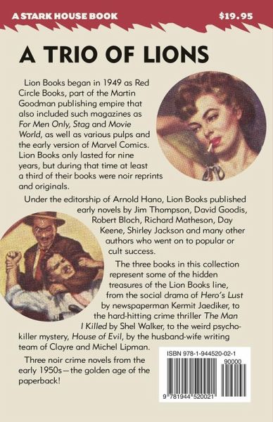 HERO’S LUST Everyone in Crescent City knows that Mayor Gowan controls the town, most of all Red Norton. Red’s an ace reporter, sure, but he’s living in the mayor’s side pocket. What the Mayor wants, he gets. And right now he wants Red to write up his new Medical Center. The Mayor needs a pitch, and finds it in tubercular Ann Porter, who is scheduled for an upcoming operation. Her story sells a lot of papers, and puts a face to the Mayor’s pet project. Red didn’t figure on falling in love with the kid, but now he’s involved. And with the Mayor making some new demands, Red is about to find out just how rotten the town really is—the hard way. THE MAN I KILLED When Lew Ross was young, he got into a fight and killed a man, then fled the scene. Haunted by this event throughout his life, he finds himself back in that same town again, at the same club where it all happened. Except that now the place is a nightclub. And this is where he meets Kitty, one of the hostesses, and her slick boss, Marty Evans, who has a proposition for Ross—pick up a delivery from a local rival, and join his crew. Evans even loans him a gun for protection. Trouble is, the pick up is a set up, and Ross is the fall guy. Now he’s in a squeeze play between a scheming D.A., an honest cop, and Evans’ thugs. And then there’s Kitty… HOUSE OF EVIL Nina Valjean needs a fix or she wouldn’t have agreed to see Smith again. Smith is one of the sick ones, but sometimes a girl can’t afford to be picky. Still, she’s got a bad feeling about this time. The next day, Roman Laird lets himself into his out-of-town fiancée’s apartment, and finds Valjean’s nude, strangled body. Things haven’t been good between he and Joyce for a while, but finding a body in her place is just crazy. Trying to protect her, Laird tracks the dead woman to a seedy bar called The Red Parrot, which is how he meets an exotic dancer named Cecille Merrill. But all this time, Smith is out there, watching him—ready to kill again.