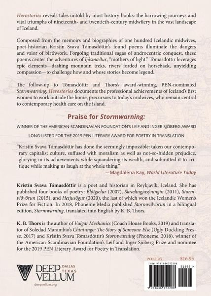 "Herostories reveals tales untold by most history books: the harrowing journeys and vital triumphs of nineteenth- and twentieth-century midwifery in the vast landscape of Iceland. Composed from the memoirs and biographies of one hundred Icelandic midwives, poet-historian Kristâin Svava Tâomasdâottir's found poems illuminate the dangers and valor of birthwork. Forgoing traditional sagas of androcentric conquest, these poems center the adventures of ljâosmµºur, "mothers of light." Tâomasdâottir leverages epic elements-dashing mountain treks, rivers forded on horseback, unyielding compassion-to challenge how and whose stories become legend. The follow-up to Tâomasdâottir/Thors's award-winning, PEN-nominated Stormwarning, Herostories documents the professional achievements of the island's first women to work outside the home, precursors to today's midwives, who remain central to contemporary Icelandic health care"--