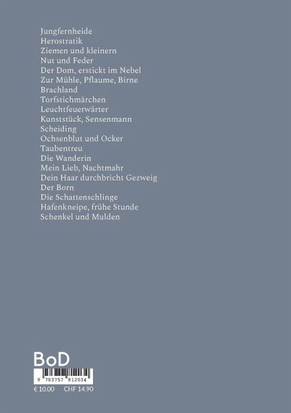 Jungfernheide / Herostratik / Ziemen und kleinern / Nut und Feder / Der Dom, erstickt im Nebel / Zur Mühle, Pflaume, Birne / Brachland / Torfstichmärchen / Leuchtfeuerwärter / Kunststück, Sensenmann / Scheiding / Ochsenblut und Ocker / Taubentreu / Die Wanderin / Mein Lieb, Nachtmahr / Dein Haar durchbricht Gezweig / Der Born / Die Schattenschlinge / Hafenkneipe, frühe Stunde / Schenkel und Mulden