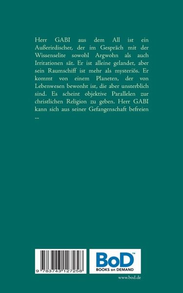 Herr Gabi aus dem All ist ein Außerirdischer, der im Gespräch mit Wissenschaftlern sowohl Argwohn als auch Irritationen sät. Er ist alleine gelandet, aber sein Raumschiff ist mehr als mysteriös. Er kommt von einem Planeten, der von Lebewesen bewohnt ist, die unsterblich sind. Es scheint objektive Parallelen zur christlichen Religion zu geben. Herr Gabi kann sich aus seiner Gefangenschaft befreien ...