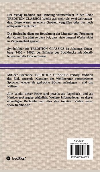 Diese Hardcover-Ausgabe ist Teil der TREDITION CLASSICS. Der Verlag tredition aus Hamburg veröffentlicht in der Buchreihe TREDITION CLASSICS Werke aus mehr als zwei Jahrtausenden. Diese waren zu einem Großteil vergriffen oder nur noch antiquarisch erhältlich. Mit TREDITION CLASSICS verfolgt tredition das Ziel, tausende Klassiker der Weltliteratur verschiedener Sprachen wieder als gedruckte Bücher zu verlegen und das weltweit! Die Buchreihe dient zur Bewahrung der Literatur und Förderung der Kultur. Sie trägt so dazu bei, dass viele tausend Werke nicht in Vergessenheit geraten.