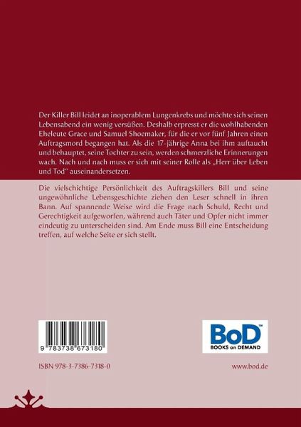 Der Killer Bill leidet an inoperablem Lungenkrebs und möchte sich seinen Lebensabend ein wenig versüßen. Deshalb erpresst er die wohlhabenden Eheleute Grace und Samuel Shoemaker, für die er vor fünf Jahren einen Auftragsmord begangen hat. Als die 17-jährige Anna bei ihm auftaucht und behauptet, seine Tochter zu sein, werden schmerzliche Erinnerungen wach. Nach und nach muss er sich mit seiner Rolle als "Herr über Leben und Tod" auseinandersetzen.Die vielschichtige Persönlichkeit des Auftragskillers Bill und seine ungewöhnliche Lebensgeschichte ziehen den Leser schnell in ihren Bann. Auf spannende Weise wird die Frage nach Schuld, Recht und Gerechtigkeit aufgeworfen, während auch Täter und Opfer nicht immer eindeutig zu unterscheiden sind. Am Ende muss Bill eine Entscheidung treffen, auf welche Seite er sich stellt.