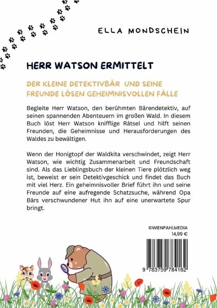 Begleite Herr Watson, den charmanten Bärendetektiv, und seine tierischen Freunde auf ihren spannenden Abenteuern im großen Wald. Dieses liebevoll gestaltete Buch entführt junge Leser in eine Welt voller Geheimnisse, Rätsel und wertvoller Lektionen über Freundschaft, Zusammenhalt und die Freude am Entdecken. In neun fesselnden Geschichten löst Herr Watson knifflige Fälle und hilft seinen Freunden, die Herausforderungen des Waldes zu meistern. Ob der verschwundene Honigtopf, ein geheimnisvoller Brief, der die Tiere auf Schatzsuche schickt, oder das Rätsel der flüsternden Bäume, jede Geschichte ist ein Abenteuer, das Kinderherzen höher schlagen lässt. Warum dieses Buch eine klare Kaufempfehlung ist: Spannende Geschichten: Jede Erzählung ist packend und voller Überraschungen, die Kinder in ihren Bann ziehen. Wertvolle Lektionen: Freundschaft, Zusammenhalt und Ehrlichkeit sind zentrale Themen, die auf spielerische Weise vermittelt werden. Zusätzlicher Spaß: Am Ende des Buches finden sich wunderschöne Ausmalbilder, die die Kreativität der Kinder fördern und zusätzlichen Spaß bieten. Ella Mondschein hat ein bezauberndes Buch geschaffen, das sowohl Kinder als auch Eltern begeistern wird. Ein echtes Lieblingsbuch für die ganze Familie voller Abenteuer, Herz und wichtigen Botschaften.