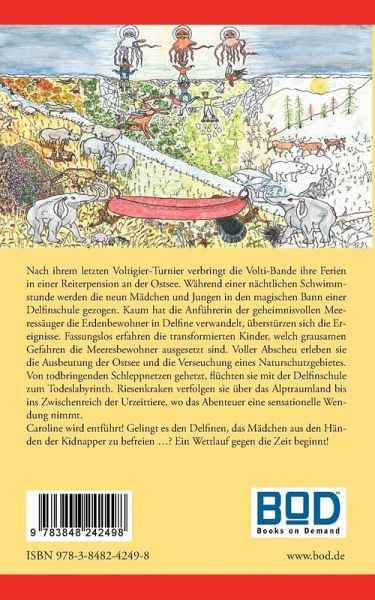 Nach ihrem letzten Voltigier-Turnier verbringt die Volti-Bande ihre Ferien in einer Reiterpension an der Ostsee. Während einer nächtlichen Schwimmstunde werden die neun Mädchen und Jungen in den magischen Bann einer Delfinschule gezogen. Kaum hat die Anführerin der geheimnisvollen Meeressäuger die Erdenbewohner in Delfine verwandelt, überstürzen sich die Ereignisse. Fassungslos erfahren die transformierten Kinder, welch grausamen Gefahren die Meeresbewohner ausgesetzt sind. Voller Abscheu erleben sie die Ausbeutung der Ostsee und die Verseuchung eines Naturschutzgebietes. Von todbringenden Schleppnetzen gehetzt, flüchten sie mit der Delfinschule zum Todeslabyrinth. Riesenkraken verfolgen sie über das Alptraumland bis ins Zwischenreich der Urzeittiere, wo das Abenteuer eine sensationelle Wendung nimmt. Caroline wird entführt! Gelingt es den Delfinen, das Mädchen aus dem Bannkreis der Kidnapper zu befreien ...? Ein Wettlauf gegen die Zeit beginnt!