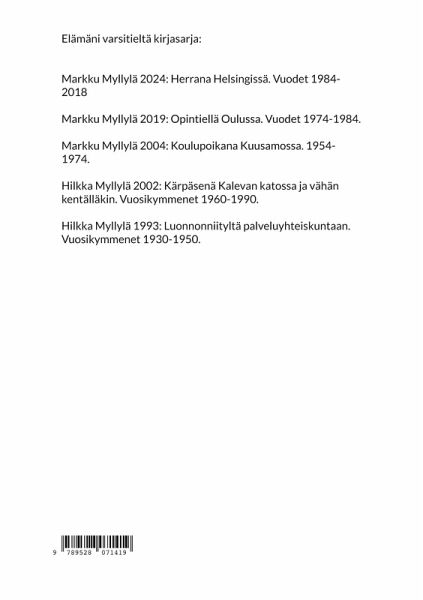 Elämäni varsitieltä kirjasarja: Markku Myllylä 2024: Herrana Helsingissä. Vuodet 1984-2018 Markku Myllylä 2019: Opintiellä Oulussa. Vuodet 1974-1984. Markku Myllylä 2004: Koulupoikana Kuusamossa. 1954-1974. Hilkka Myllylä 2002: Kärpäsenä Kalevan katossa ja vähän kentälläkin. Vuosikymmenet 1960-1990. Hilkka Myllylä 1993: Luonnonniityltä palveluyhteiskuntaan. Vuosikymmenet 1930-1950.