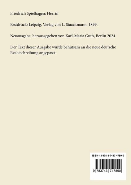 Friedrich Spielhagen: Herrin. RomanErstdruck: Leipzig, Verlag von L. Staackmann, 1899.Neuausgabe, herausgegeben von Karl-Maria Guth, Berlin 2024.Der Text dieser Ausgabe wurde behutsam an die neue deutsche Rechtschreibung angepasst.Umschlagabbildung: Silvestro Leha, Junge Frau mit schwarzem HaarGesetzt aus der Minion Pro, 11 pt.Henricus - Edition Deutsche Klassik GmbH