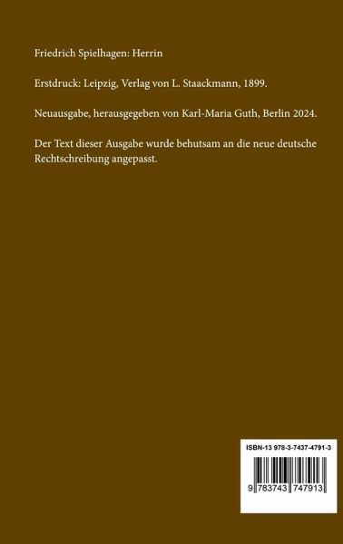 Friedrich Spielhagen: Herrin. RomanErstdruck: Leipzig, Verlag von L. Staackmann, 1899.Neuausgabe, herausgegeben von Karl-Maria Guth, Berlin 2024.Der Text dieser Ausgabe wurde behutsam an die neue deutsche Rechtschreibung angepasst.Umschlagabbildung: Silvestro Leha, Junge Frau mit schwarzem HaarGesetzt aus der Minion Pro, 11 pt.Henricus - Edition Deutsche Klassik GmbH