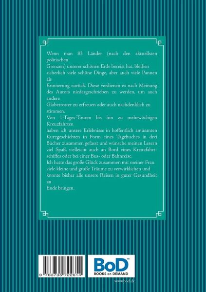 Wenn man 83 Länder (nach den aktuellsten politischen Grenzen) unserer schönen Erde bereist hat, bleiben sicherlich viele schöne Dinge, aber auch viele Pannen alsErinnerung zurück. Diese verdienen es nach Meinung des Autors niedergeschrieben zu werden, um auch andere Globetrotter zu erfreuen oder auch nachdenklich zustimmen.Von 1-Tages-Touren bis hin zu mehrwöchigen Kreuzfahrten haben ich unsere Erlebnisse in hoffentlich amüsanten Kurzgeschichten in Form eines Tagebuches in drei Bücher zusammen gefasst und wünsche meinen Lesern viel Spaß, vielleicht auch an Bord eines Kreuzfahrtschiffes oder bei einer Bus- oder Bahnreise.Ich hatte das große Glück zusammen mit meiner Frau viele kleine und große Träume zu verwirklichen und konnte bisher alle unsere Reisen in guter Gesundheit zu Ende bringen.