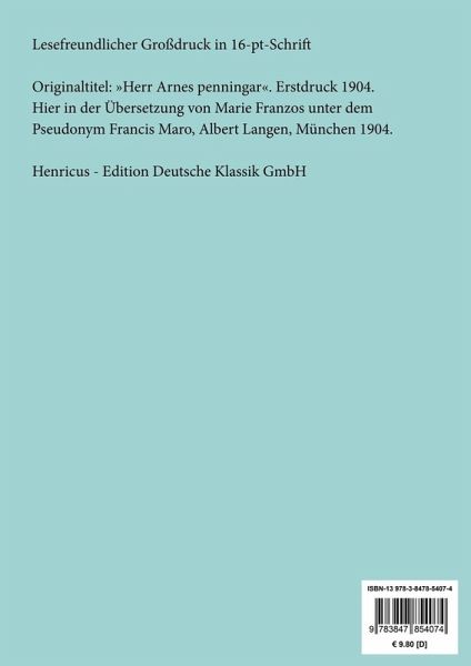 Selma Lagerlöf: Herrn Arnes Schatz. Eine ErzählungLesefreundlicher Großdruck in 16-pt-SchriftGroßformat, 210 x 297 mmBerliner Ausgabe, 2022Durchgesehener Neusatz bearbeitet und eingerichtet von Theodor BorkenOriginaltitel: »Herr Arnes penningar«. Erstdruck 1904. Hier in der Übersetzung von Marie Franzos unter dem Pseudonym Francis Maro, Albert Langen, München 1904.Umschlagabbildung: Esaias van de Velde, Der Überfall, 1616Gesetzt aus der Minion Pro, 16 pt.Henricus - Edition Deutsche Klassik GmbH