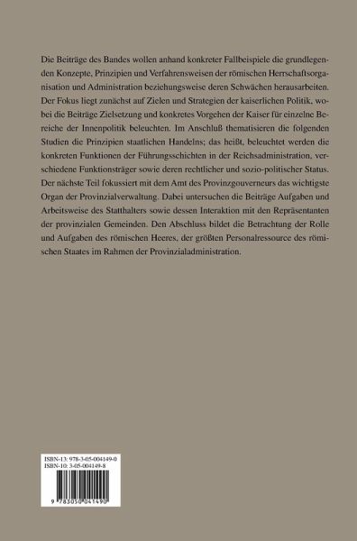 Die Beiträge des Bandes wollen anhand konkreter Fallbeispiele die grundlegenden Konzepte, Prinzipien und Verfahrensweisen der römischen Herrschaftsorganisation und Administration bzw. deren Schwächen herausarbeiten. Der Fokus liegt zunächst auf Zielen und Strategien der kaiserlichen Politik, wobei die Beiträge Zielsetzung und konkretes Vorgehen der Kaiser für einzelne Bereiche der Innenpolitik beleuchten. Im Anschluss thematisieren die folgenden Studien die Prinzipien staatlichen Handelns; d.h., beleuchtet werden die konkreten Funktionen der Führungsschichten in der Reichs-administration, verschiedene Funktionsträger sowie deren rechtlicher und sozio-politischer Status. Der nächste Teil fokussiert mit dem Amt des Provinzgouverneurs das wichtigste Organ der Provinzialverwaltung. Dabei untersuchen die Beiträge Aufgaben und Arbeitsweise des Statthalters sowie dessen Interaktion mit den Repräsentanten der provinzialen Gemeinden. Den Abschluss bildet die Betrachtung der Rolle und Aufgaben des römischen Heeres, der größten Personalressource des römischen Staates im Rahmen der Provinzialadministration.