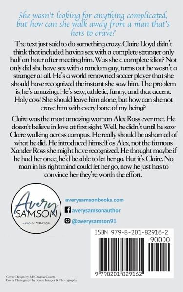 She wasn't looking for anything complicated, but how can she walk away from a man that's hers to crave? The text just said to do something crazy. Claire Lloyd didn't think that included having sex with a complete stranger only half an hour after meeting him. Was she a complete idiot? Not only did she have sex with a random guy, turns out he wasn't a stranger at all. He's a world renowned soccer player that she should have recognized the instant she saw him. The problem is, he's amazing. He's sexy, athletic, funny, and that accent. Holy cow! She should leave him alone, but how can she not crave him with every bone of my being? Claire was the most amazing woman Alex Ross ever met. He doesn't believe in love at first sight. Well, he didn't until he saw Claire walking across campus. He really should be ashamed of what he did. He introduced himself as Alex, not the famous Xander Ross she might have recognized. He thought maybe if he had her once, he'd be able to let her go. But it's Claire. No man in his right mind could let her go, now he just has to convince her they're worth the effort.