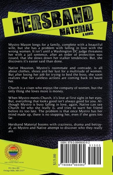 Mystro Mason longs for a family, complete with a beautiful wife, but she has a problem with falling in love with the wrong women. It is not until a Washington DC judge threatens her with a jail sentence, after an order of protection was issued, that she slows down her stalker tendencies. But, she discovers it is easier said than done. Native Houston, Mystros roommate and comrade, is all about clothes, shoes and her lust for a multitude of women. But after losing her job for trying to bed the boss, she soon realizes that her careless actions are coming back to haunt her. Church is a vixen who enjoys the company of women, but the only thing she loves more is money. When Mystro meets Church, it is love at first sight in her eyes. But, everything that looks good is not always good for you. Although Mystro is busy falling in love, again, Native can see Church for who she really is, and tries to warn her friend before its too late. The problem is that once Mystro has her mind made up, there is no stopping her, even if she goes too far. Hersband Material booms with craziness, drama and betrayal, as Mystro and Native attempt to discover who they really are.