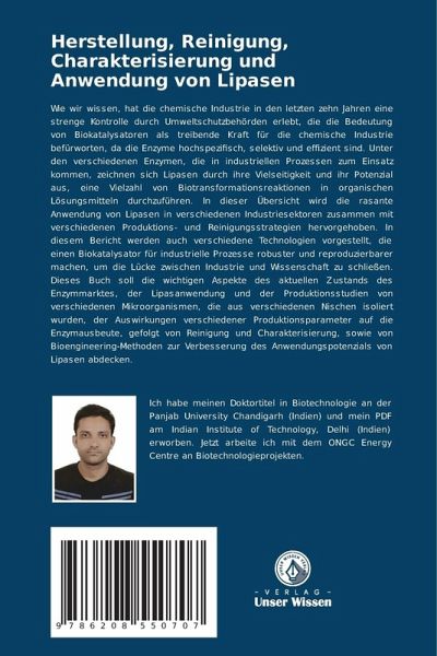 Wie wir wissen, hat die chemische Industrie in den letzten zehn Jahren eine strenge Kontrolle durch Umweltschutzbehörden erlebt, die die Bedeutung von Biokatalysatoren als treibende Kraft für die chemische Industrie befürworten, da die Enzyme hochspezifisch, selektiv und effizient sind. Unter den verschiedenen Enzymen, die in industriellen Prozessen zum Einsatz kommen, zeichnen sich Lipasen durch ihre Vielseitigkeit und ihr Potenzial aus, eine Vielzahl von Biotransformationsreaktionen in organischen Lösungsmitteln durchzuführen. In dieser Übersicht wird die rasante Anwendung von Lipasen in verschiedenen Industriesektoren zusammen mit verschiedenen Produktions- und Reinigungsstrategien hervorgehoben. In diesem Bericht werden auch verschiedene Technologien vorgestellt, die einen Biokatalysator für industrielle Prozesse robuster und reproduzierbarer machen, um die Lücke zwischen Industrie und Wissenschaft zu schließen. Dieses Buch soll die wichtigen Aspekte des aktuellen Zustands des Enzymmarktes, der Lipasanwendung und der Produktionsstudien von verschiedenen Mikroorganismen, die aus verschiedenen Nischen isoliert wurden, der Auswirkungen verschiedener Produktionsparameter auf die Enzymausbeute, gefolgt von Reinigung und Charakterisierung, sowie von Bioengineering-Methoden zur Verbesserung des Anwendungspotenzials von Lipasen abdecken.