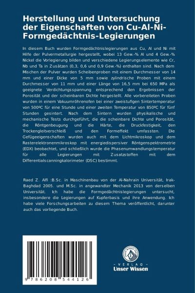 In diesem Buch wurden Formgedächtnislegierungen aus Cu, Al und Ni mit Hilfe der Pulvermetallurgie hergestellt, wobei 13 Gew.-% Al und 4 Gew.-% Nickel die Vorlegierung bilden und verschiedene Legierungselemente wie Cr, Nb und Ta in Zusätzen (0,3, 0,6 und 0,9 Gew.-%) enthalten sind. Nach dem Mischen der Pulver wurden Scheibenproben mit einem Durchmesser von 14 mm und einer Dicke von 5 mm sowie zylindrische Proben mit einem Durchmesser von 11 mm und einer Länge von 16,5 mm bei 650 MPa als geeignete Verdichtungsspannung entsprechend den Ergebnissen der Porosität und der scheinbaren Dichte hergestellt. Alle vorbereiteten Proben wurden in einem Vakuumröhrenofen bei einer zweistufigen Sintertemperatur von 500ºC für eine Stunde und einer zweiten Temperatur von 850ºC für fünf Stunden gesintert. Nach dem Sintern wurden physikalische und mechanische Tests durchgeführt, die die scheinbare Dichte und Porosität, die Röntgenbeugung und die Härte, die Druckfestigkeit, den Trockengleitverschleiß und den Formeffekt umfassten. Die Gefügeeigenschaften wurden auch mit dem Lichtmikroskop und dem Rasterelektronenmikroskop mit energiedispersiver Röntgenspektrometrie (EDX) beobachtet, und schließlich wurde die Phasenumwandlungstemperatur für alle Legierungen mit Zusatzstoffen mit dem Differentialscanningkalorimeter (DSC) bestimmt.